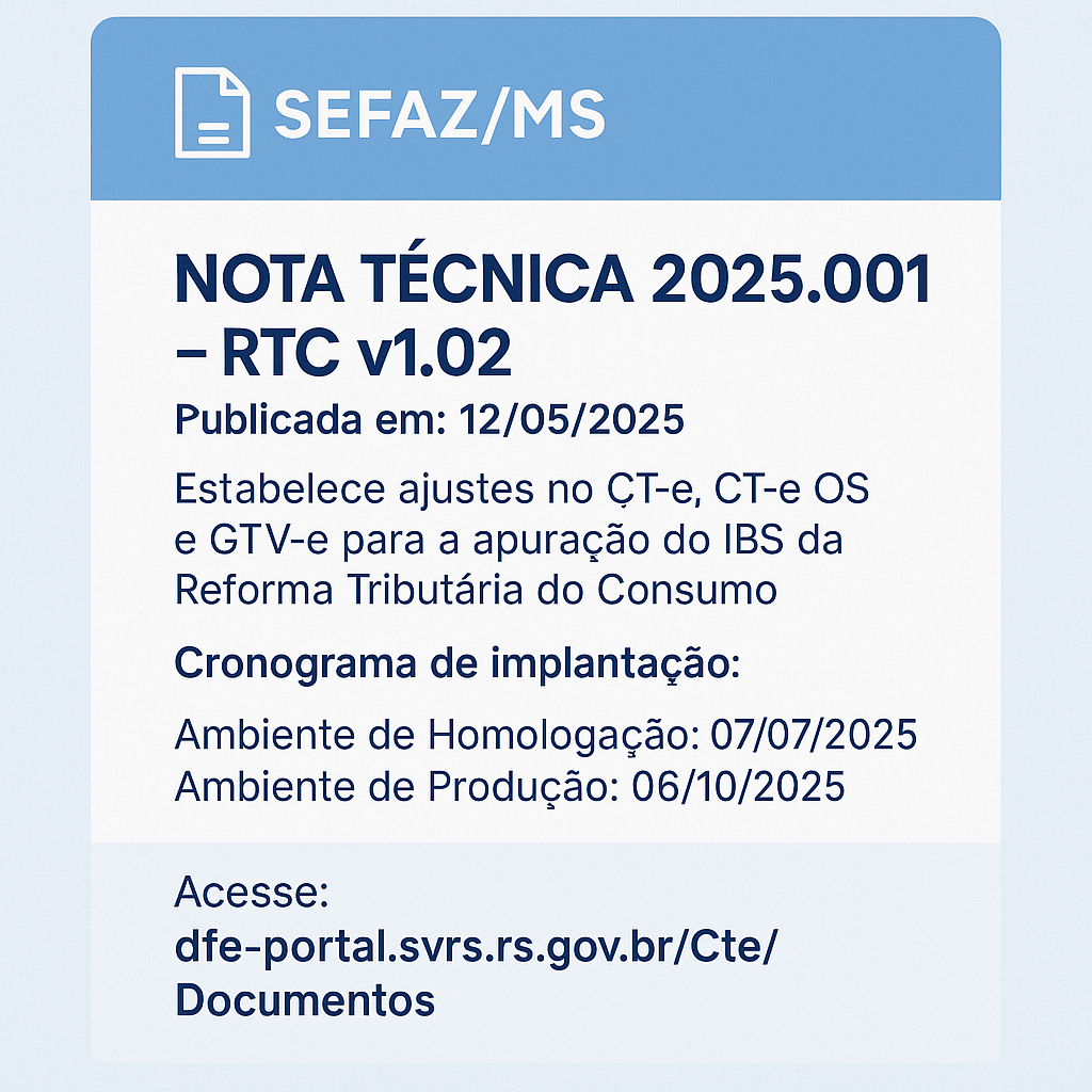 Foi publicada a Nota Técnica 2025.001 – RTC v1.02, referente ao CT-e, CT-e OS e GTV-e, que trata das alterações necessárias para atendimento à Reforma Tributária do Consumo.